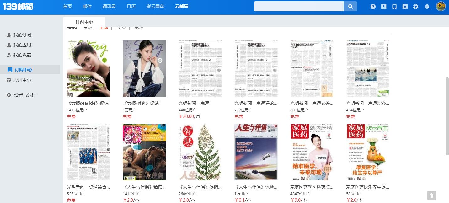 139邮箱云邮局大部分杂志内容与同名纸质杂志相同,少部分只有“电子杂志”,市面无对应的纸质版。杂志的更新周期比资讯长,一般为周刊、半月刊或月刊。“杂志”包括:学习、财经、时事、健康、科技、娱乐、时尚、休闲、体育、汽车、旅游、摄影等多个分类。每本杂志价格不同,相关资费标准会在页面上显示。