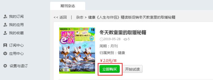 2、点击需要订阅的杂志内容卡片,进入杂志详情页面后点击“立即购买”;