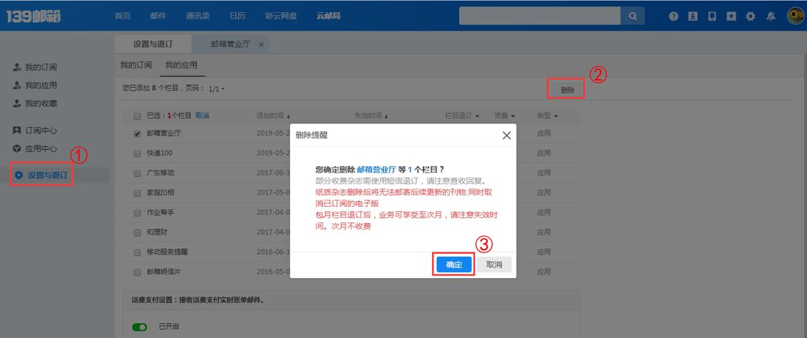 登录邮箱>>云邮局>>设置和退订,进入“设置和退订”页面,勾选需要删除的“应用”栏目,点击页面右上方“删除”按钮,在弹出的确认框中点击“确定”即可。