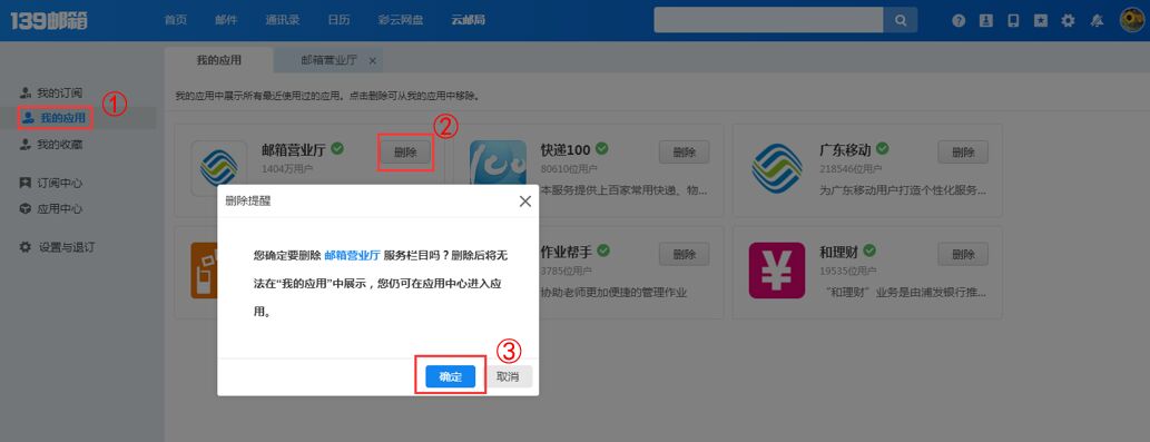 登录邮箱>>云邮局>>我的应用,进入“我的应用”页面后,点击“应用”内容卡片右侧“删除”按钮,在弹出的确认框中点击“确定”即可。