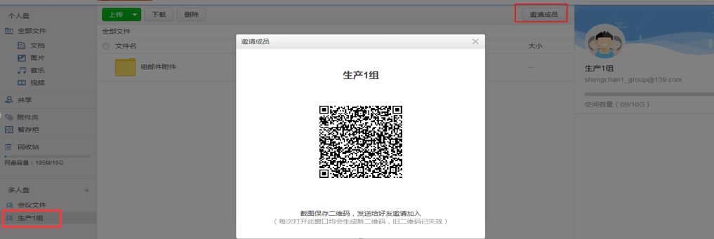 1.创建者创建多人盘后,通过页面右上角“邀请成员”获取邀请成员二维码,并分享给成员;